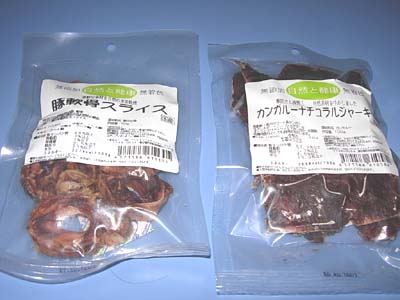 の4点です。 保存料とか添加物が入っていないのでワン達に良い商品だと思います。 とりあえず「ささみ」をあげてみました。 凄い食べっぷりです。 今までたまにしか挙げていたので、今回は良い買い物をしました。 でも、「ささみ」は初めてあげたのでうんちが少々下痢ぎみでした。 「豚の喉骨」の時は大丈夫だったのですが・・・。 次回はFood と一緒に頼んで5250円以上になるように計算して購入してみます。 全国発送可能ですので頼んでみては如何でしょうか。。 |